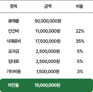 모든 메뉴가 평균 35% 이하의 원가율로 유지되도록 설계되어,